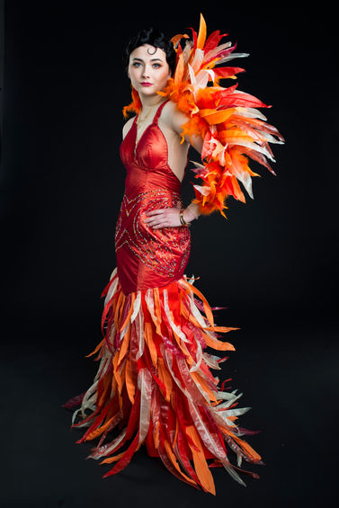Interpreting a high fashion garment without the need to use 100% raw/new materials. This costume was based on 75% recycled material including old prom dresses and scrap fabrics with handmade feathers replacing the natural cock feathers yet still creating an impact..